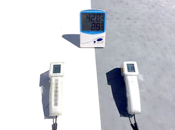 | 遮熱塗装とは、屋上や屋根、壁に対して熱の影響を受けにくい塗料を塗ることで、直射日光や照り返しによる急激な気温の上昇を避けるための塗装です。 こちらの比較写真をご覧ください。左が遮熱塗装を行った方の温度です。 左が39.3度、右が61.0度。約22度も温度が違っています。 |